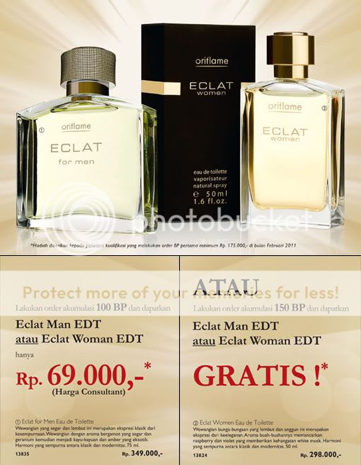 Oriflame ada promo lagi lohh. Berlaku mulai hari ini, tanggal 3 Januari 2011 sampai dengan tanggal 31 Januari 2011. Promo "Eclat Fragrance" namanya. Udah pada tau kan Eclat?? Itu tuh, salah satu Eau de Toilette punya Oriflame yang tersedia untuk pria dan wanita.