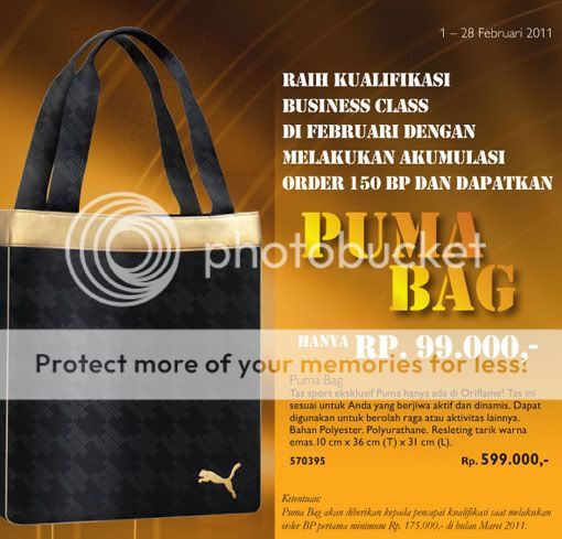 Cukup dengan meraih kualifikasi Business Class di Februari dengan melakukan akumulasi order 150 BP dan dapatkan PUMA BAG Hanya Rp. 99.000,- di bulan Maret 2011.