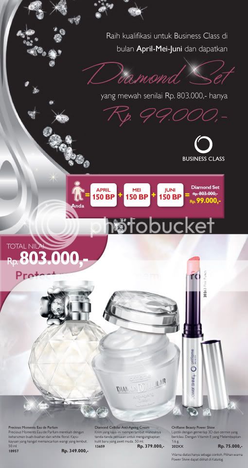 Bagi pengikut setia info-info Oriflame, pasti sudah mengenal BC Loyalti Program. Karena pada tiga bulan sebelumnya, Oriflame sudah mengeluarkan promo ini. Ternyata April di launching lagi, dan pasti hadiahnya tidak kalah menarik dengan sebelumnya. Dengan meraih kualifikasi BC selama bulan April, Mei dan Juni 2011, maka Anda berhak mendapatkan paket "Diamond Set" senilai Rp. 803.000 cukup dengan membayar Rp. 99.000,-.